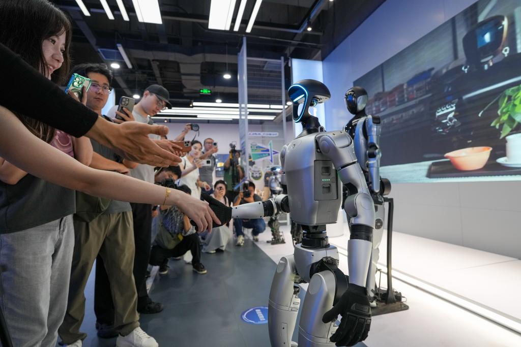 2025年7月3日,在位于安徽省芜湖市的埃夫特智能机器人股份有限公司内,工作人员与一款人形机器人“握手”。新华社记者 张铖 摄