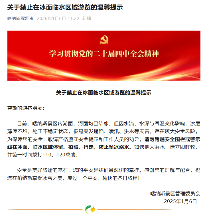 喀纳斯景区发布提示:禁止在冰面临水区域游览
