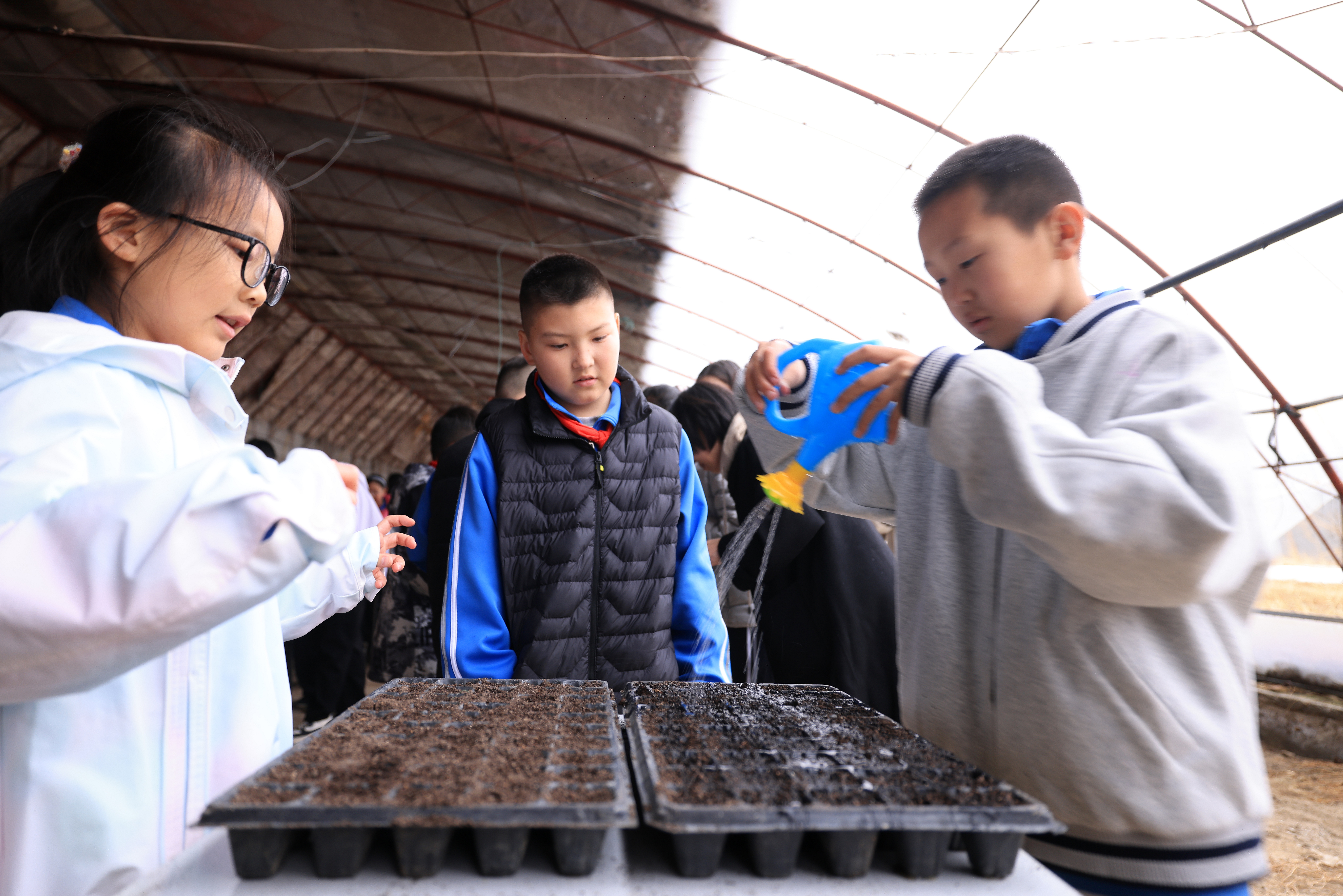 活动中,孩子们在农技人员的指导下学习松土、播种,聆听农业科普讲解。一粒粒种子、一株株幼苗,成为生动的科普教材,孩子们“零距离”接触现代农业,在实践中增长知识、亲近自然,享受大棚里的“耕读童趣”。