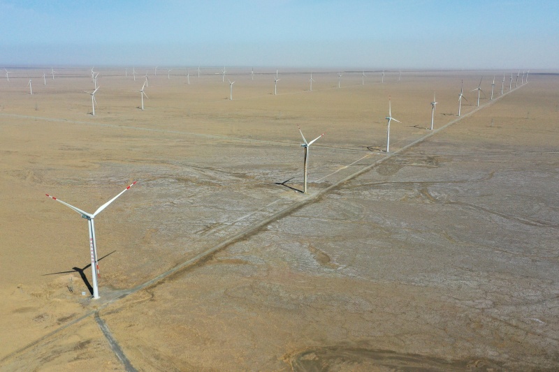 这是在新疆巴音郭楞蒙古自治州若羌县拍摄的新天绿色能源股份有限公司新天若羌县罗布庄10万千瓦风电项目(2025年6月27日摄,无人机照片)。新华社记者 丁磊 摄