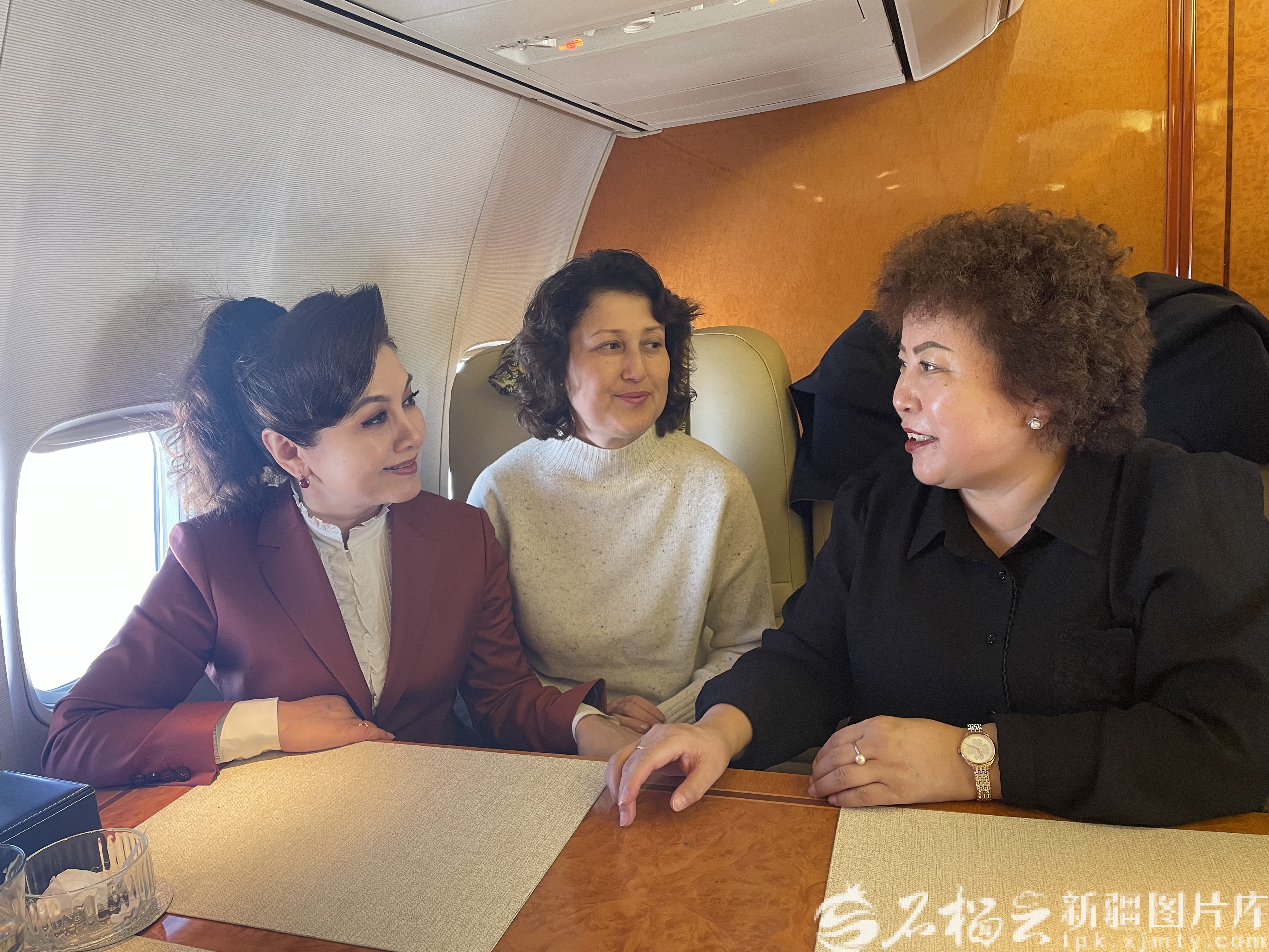 图为3月3日,迪丽娜尔·阿布拉委员(左)同木合拜尔·阿布都尔委员(中)、阿衣木沙·托合塔洪委员(右)在航班上交流。天山网-新疆日报记者 李杨摄